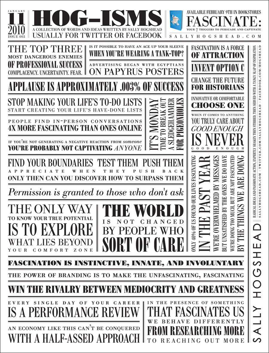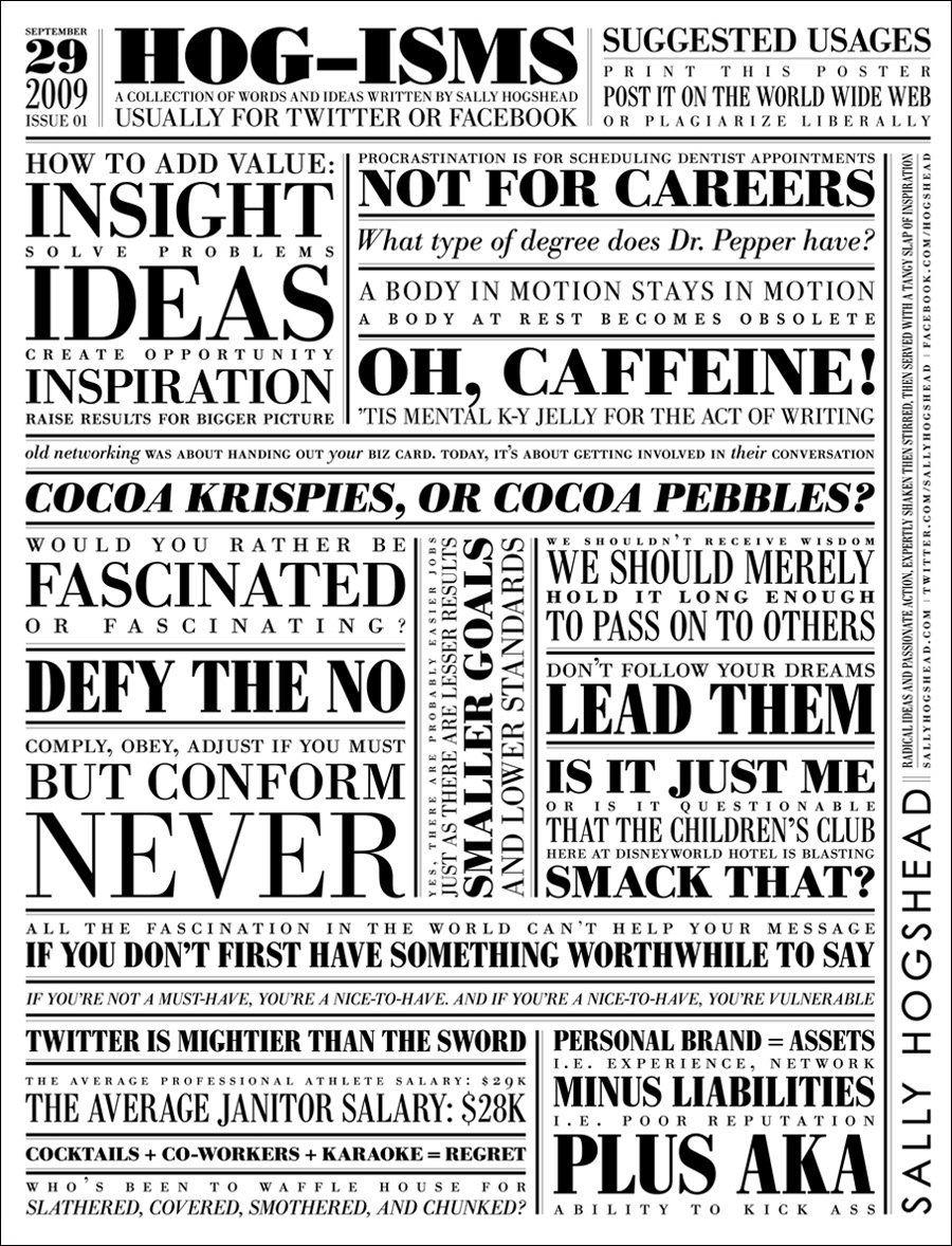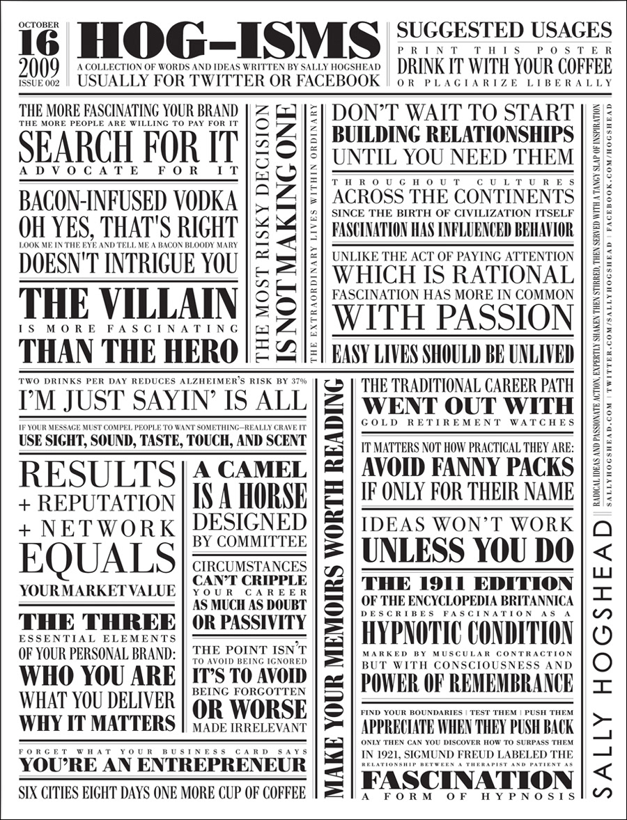Sally Hogshead commissioned me to create a series of posters that she called, "Hog-isms." They were a compilation of tweets she had been tweeting to prepare the way for her book, "Fascinate."